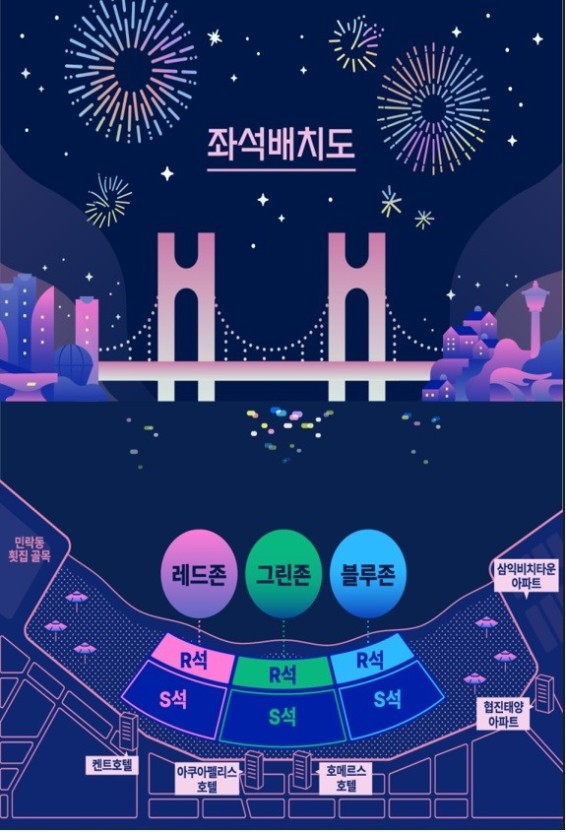 부산 불꽃축제는 무료로 관람할 수 있지만 더 좋은 자리에서 편안하게 관람하고 싶으시다면 유료 좌석을 예매하시면