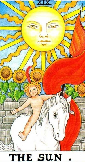 태양카드 19에 등장하는 아이의 표정이 참으로 밝습니다. 하얀색 말의 의미도 희망을 상징합니다. 저 뒤의 벽이 보이는 곳은 이제 모든 어려움을 지나 찬란한 태양이 비추듯 일이 잘 될 것이라는 희망의 메시지를 전해 주고 있습니다. 찬란히 빛나는 태양은 신이 사람들에게 주는 은총을 상징하는데 이렇듯 이분에게도 행운처럼 기쁜 소식이 올 것이라는 것을 보여 주고 있습니다. 해바라기 꽃이 많이 보이는데 이 꽃 또한 긍정적인 기쁨, 태양에 관한 순종적인 의미를 담고 있어요. 저 펄럭이는 붉은 깃발이 보이시나요? 이는 실천의지가 강렬함을 뜻하며 정열, 명예를 상징합니다. 과시욕이나 성취욕을 보이기도 하지요. 그런데 아이가 말 위에서 안전장치 없이 앉아 있으므로 운이 좋다 하더라도 조심하는 미덕이 필요한 것입니다. 그러나 소원하는 것을 곧 이루게 되실 당신은 즐기고 과시할 자격이 있습니다. 그동안 수고 많았으니 이젠 즐기며 제 충전의 시간을 갖고 새로운 시간을 맞이할 준비를 하라고 말씀드리고 싶네요.